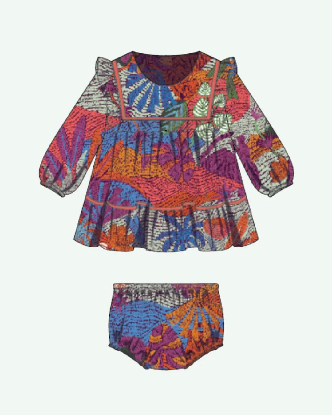 Tiny but mighty in style. The Blair Set brings all the fall magic in a pint-sized silhouette, featuring our favorite woodland-inspired print in rich jewel tones. The square neckline and sweet ruffle shoulders add just the right touch of charm, while the matching bloomers keep her cozy and cute all season long.