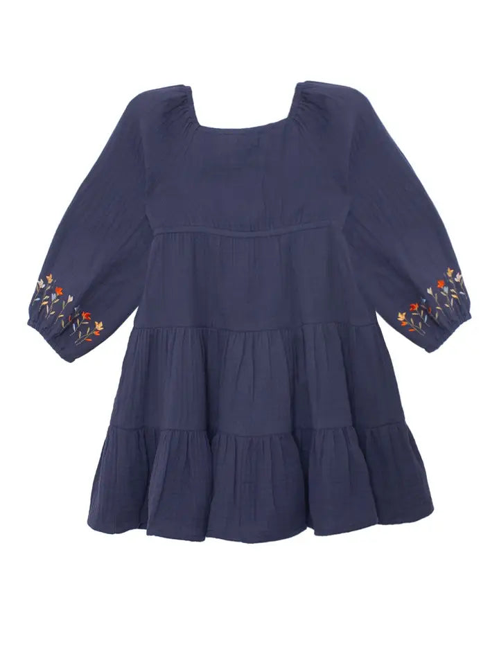 The Clara Dress from Mabel + Honey is a picture of timeless style and thoughtful design, perfect for girls' everyday adventures or special moments. Its navy blue fabric showcases a beautifully multi-tiered silhouette, creating a flowing, ruffled effect that?s both playful and elegant. The delicate embroidered floral patterns on the chest and sleeve cuffs, bring a burst of color to the dress, making it a head-turner for any occasion.
