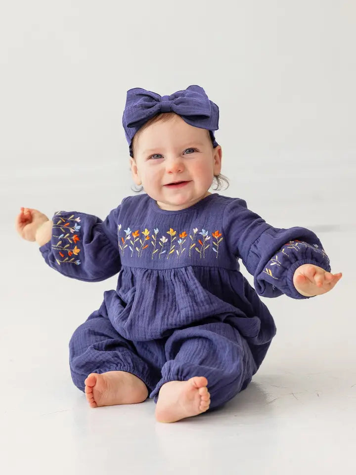 This romper is designed in a deep navy hue that creates a striking contrast against its colorful floral embroidery, featuring delicate patterns in warm shades of orange, yellow, and white across the chest and sleeves. Made with lightweight, breathable fabric, it ensures your baby stays comfy all day long, whether they?re exploring or napping.
