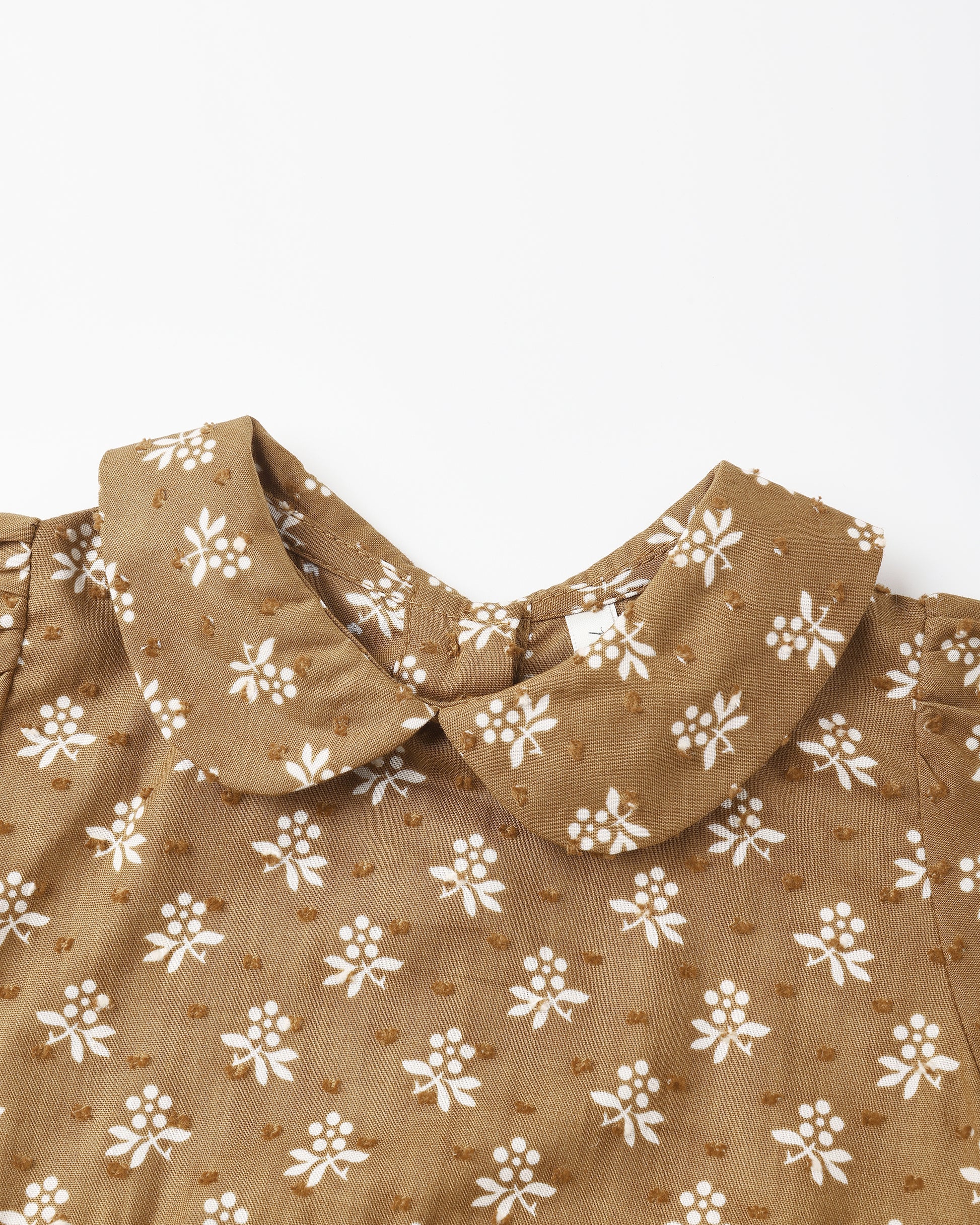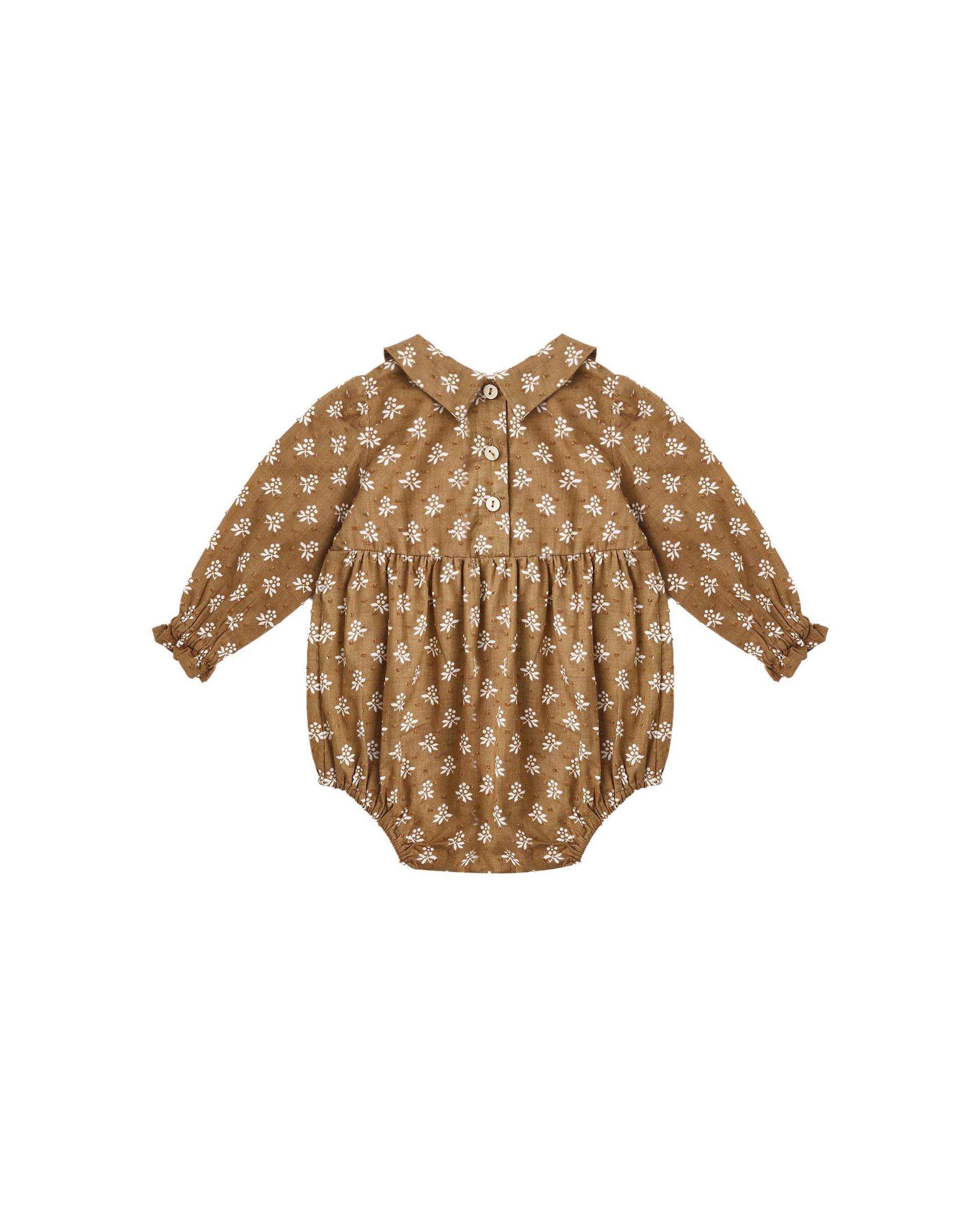 Sweet baby one-piece with a charming Peter Pan collar and long sleeves. Features bottom snaps and a back closure with four coconut buttons for easy changing.