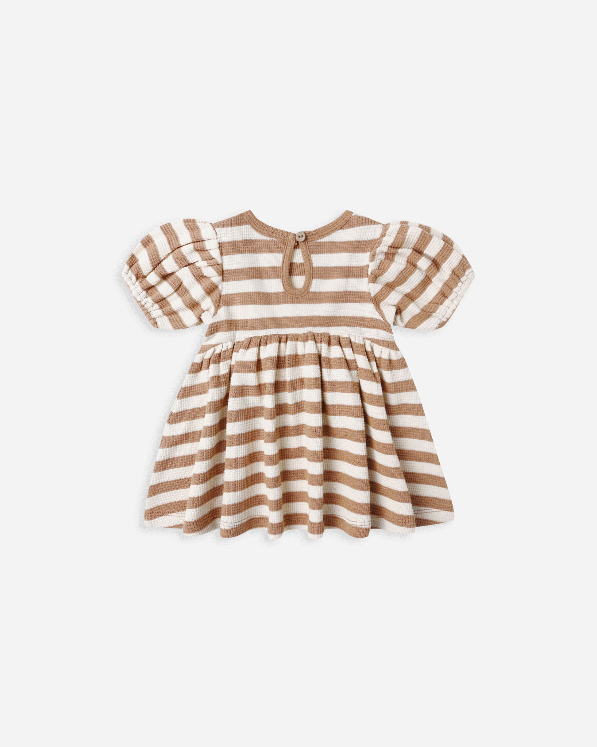 Our waffle knit Darla Dress features a babydoll silhouette with an empire waist, balloon sleeves, and a coconut button keyhole at the back. Coordinating bloomers included with all sizes.