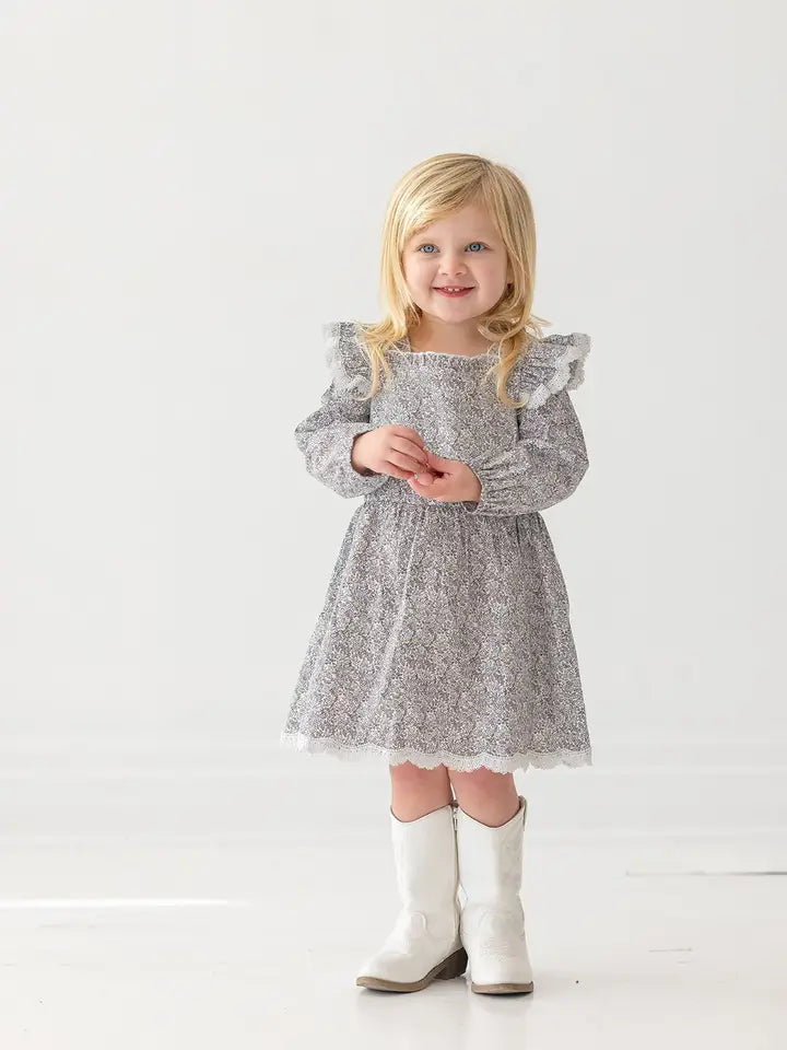Effortlessly elegant, the Elizabeth dress for girls is a delightful addition to any wardrobe. Its lightweight fabric is adorned with an intricate floral pattern, while delicate white lace accents add an extra touch of refinement. Featuring a square neck design, ruffled trim, and elastic-cuffed long sleeves, this dress combines timeless style with a perfect, comfortable fit for everyday elegance.