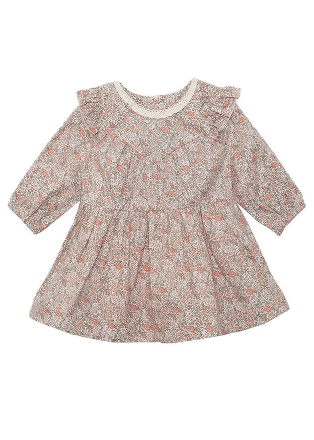 The Emmaline Romper is a delightful addition to your little one?s wardrobe. Crafted with soft, breathable fabric in a muted pink and orange floral pattern, its design exudes timeless charm. Thoughtful details like ruffled shoulders, a delicate lace-trimmed neckline, and a gathered waist add a touch of elegance. Perfectly blending comfort and style, this romper is ready to accompany your baby girl through her most precious moments.