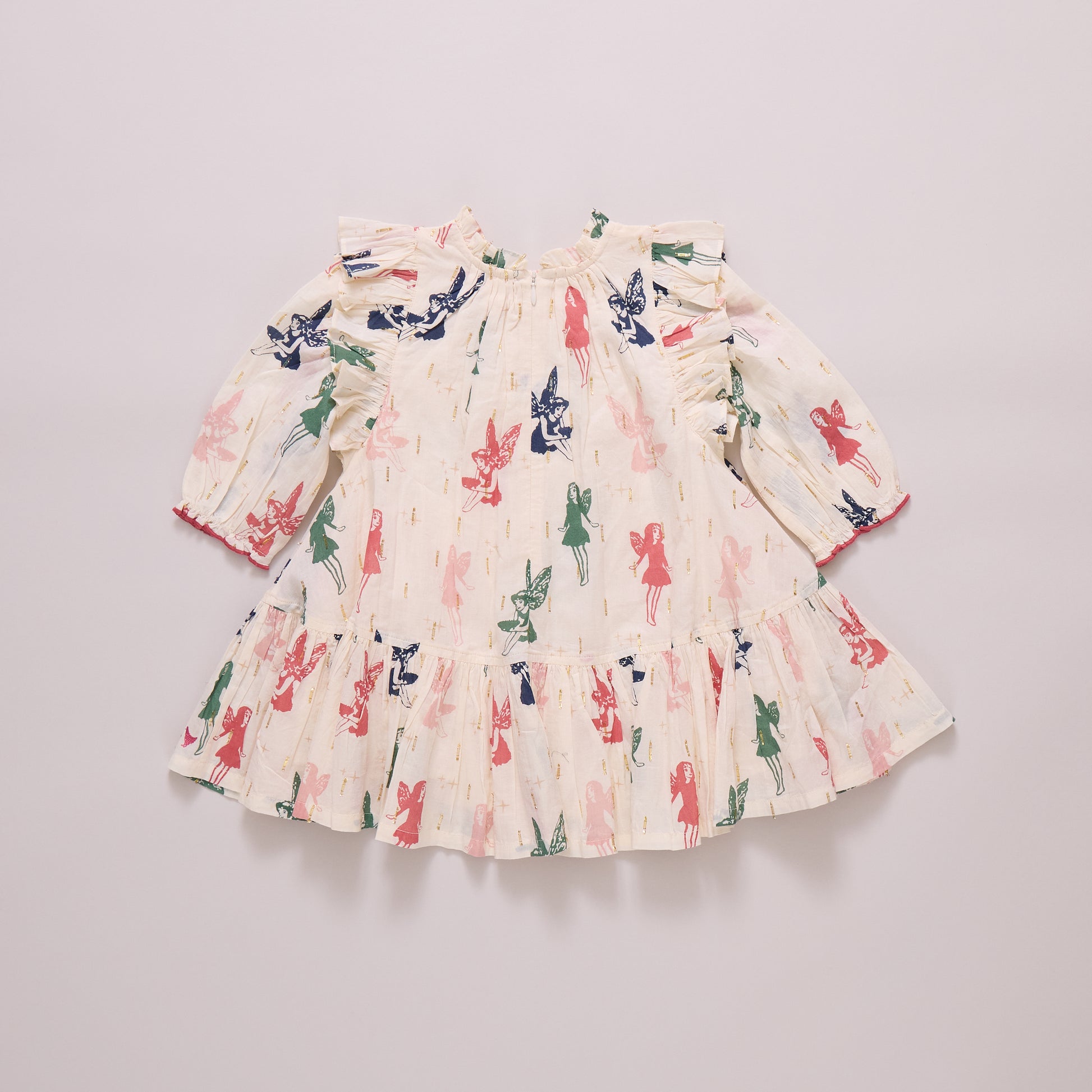 Delightful Dreamscape! A flutter of fairies, in shades of pink, forest and ink alight on a creamy ground in our dreamy Girls Harper Dress. This super swingy silohuette features a micro ruffle at the neck, a fluttery ruffle cap at the long sleeve, a ruffled bottom tier of the skirt and a delicate pink pearl stitch at the cuff. Invisible zipper closure at the back. Shimmery gold stars twinkle throughout adding a magical effect.