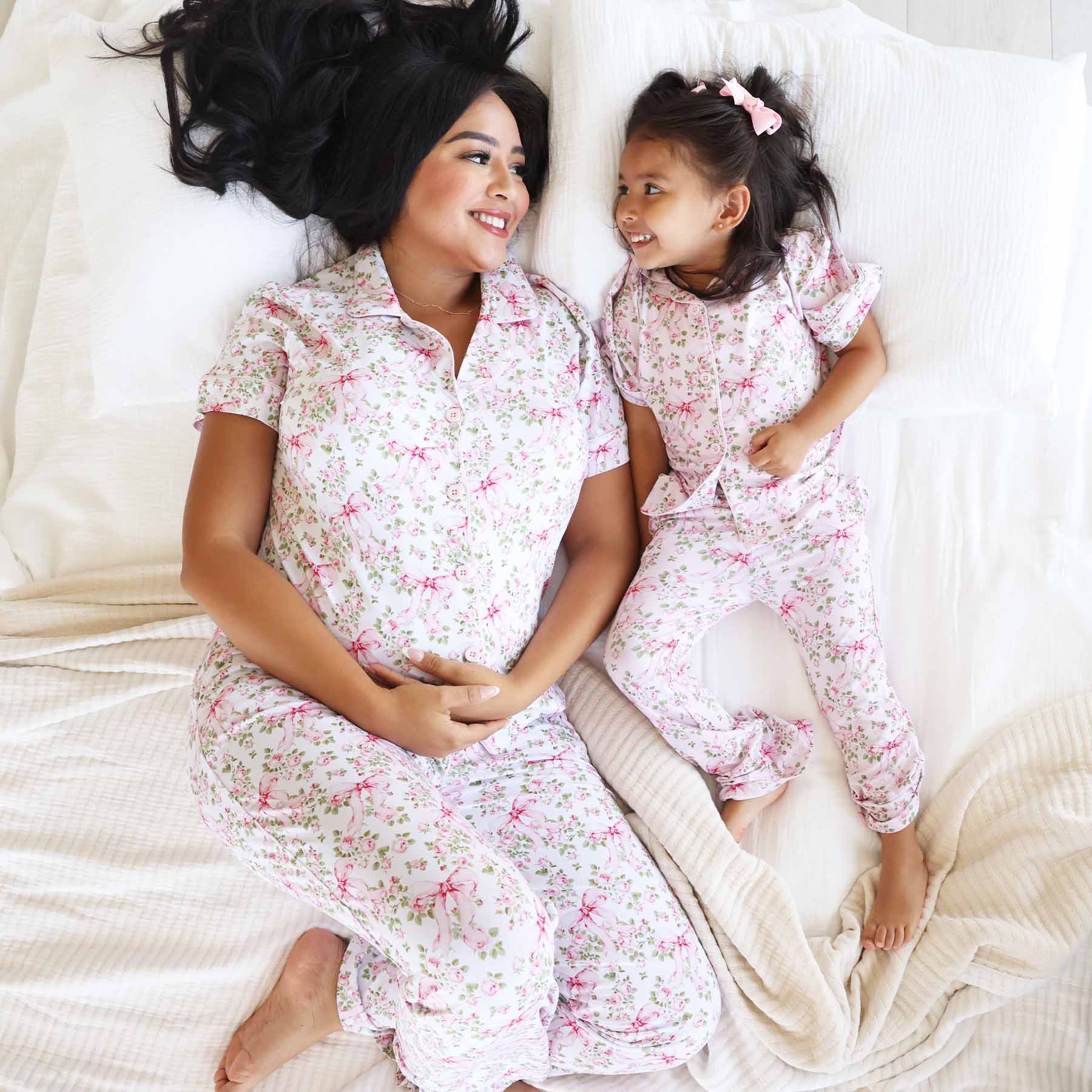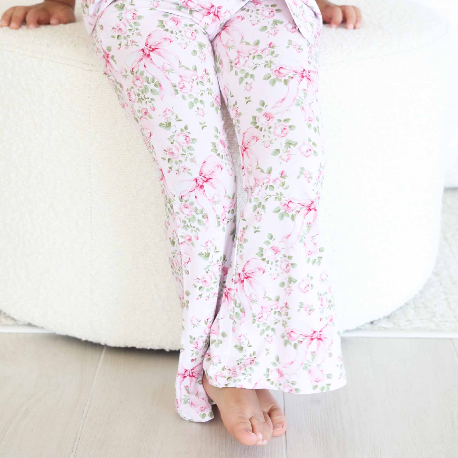 * Bows In Bloom women's lounge set has a white background with pink florals, kid and baby styles have a pink background with pink florals