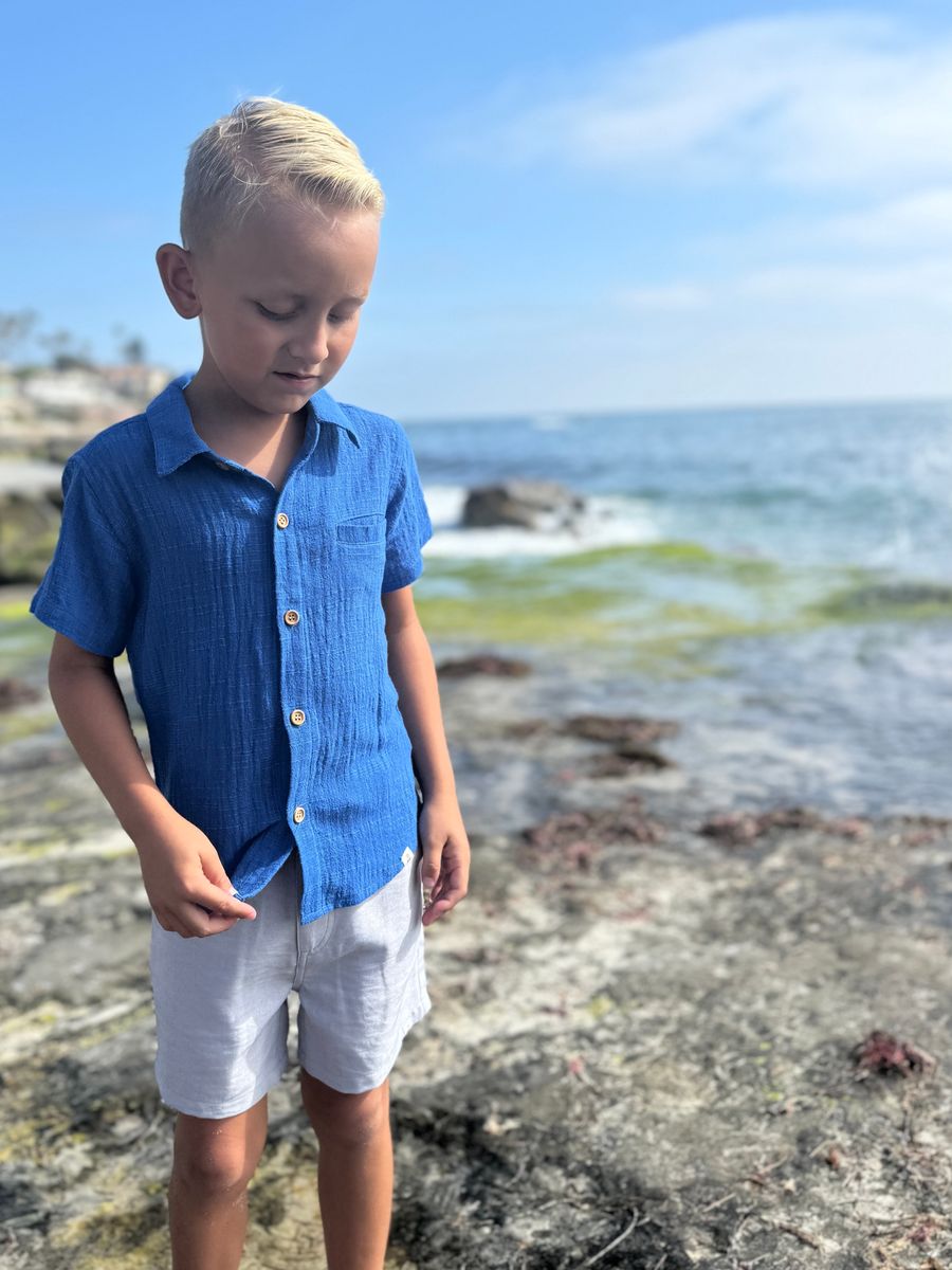 This classic royal Newport Woven Shirt combines smart style with essential comfort, making it perfect for vacations and everyday wear. Featuring elegant wooden buttons and the distinctive Me & Henry canvas tab at the hem, it’s designed to become your little one's favorite wardrobe staple.