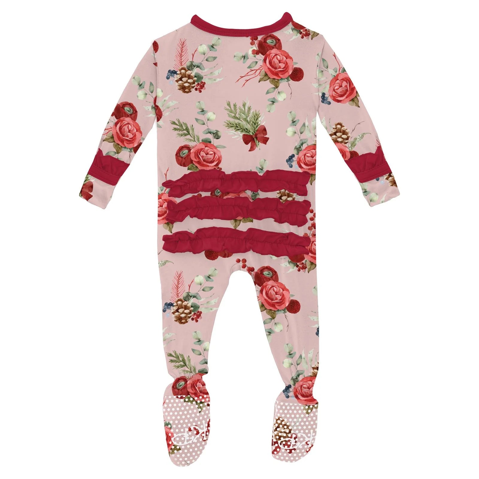 Print Muffin Ruffle Footie with 2 Way Zipper // Baby Rose Holiday Floral