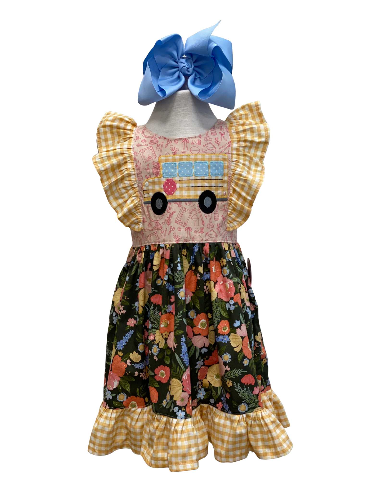 Your little will be the talk of the playground with this handmade, custom designed dress! Featuring a school bus applique and a gorgeous ruffled skirt, your little girl will definitely make a statement on her first day of school! Handmade in Beeville, TX.