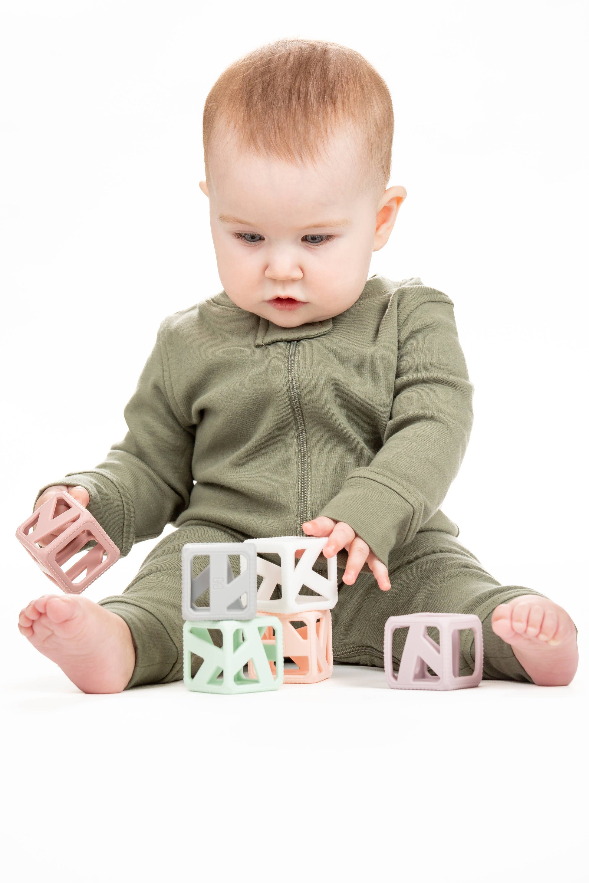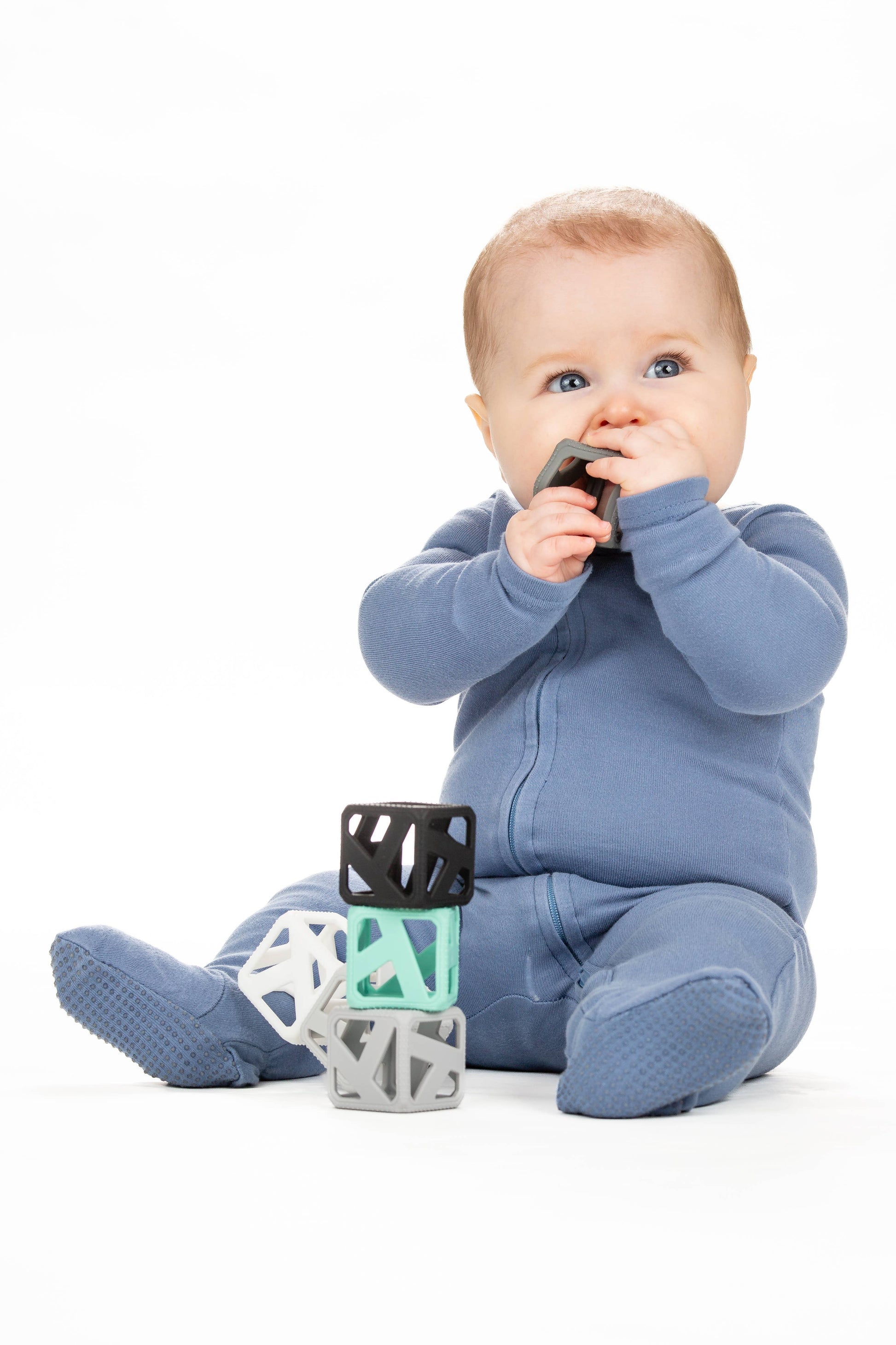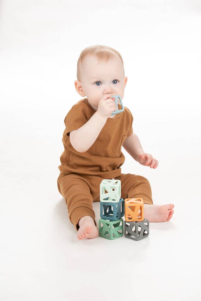 The Stack N Chew Mini Cube is a developmental teething toy. It's BPA-Free and made of food-grade silicone making it safe for baby's tender gums. The flexible holes help strengthen baby's gripping skills. The contrasting modern colors stimulate hand-eye coordination and promote motor skills such as stacking and carrying. Easy to travel with, it encourages imagination - even for water play!