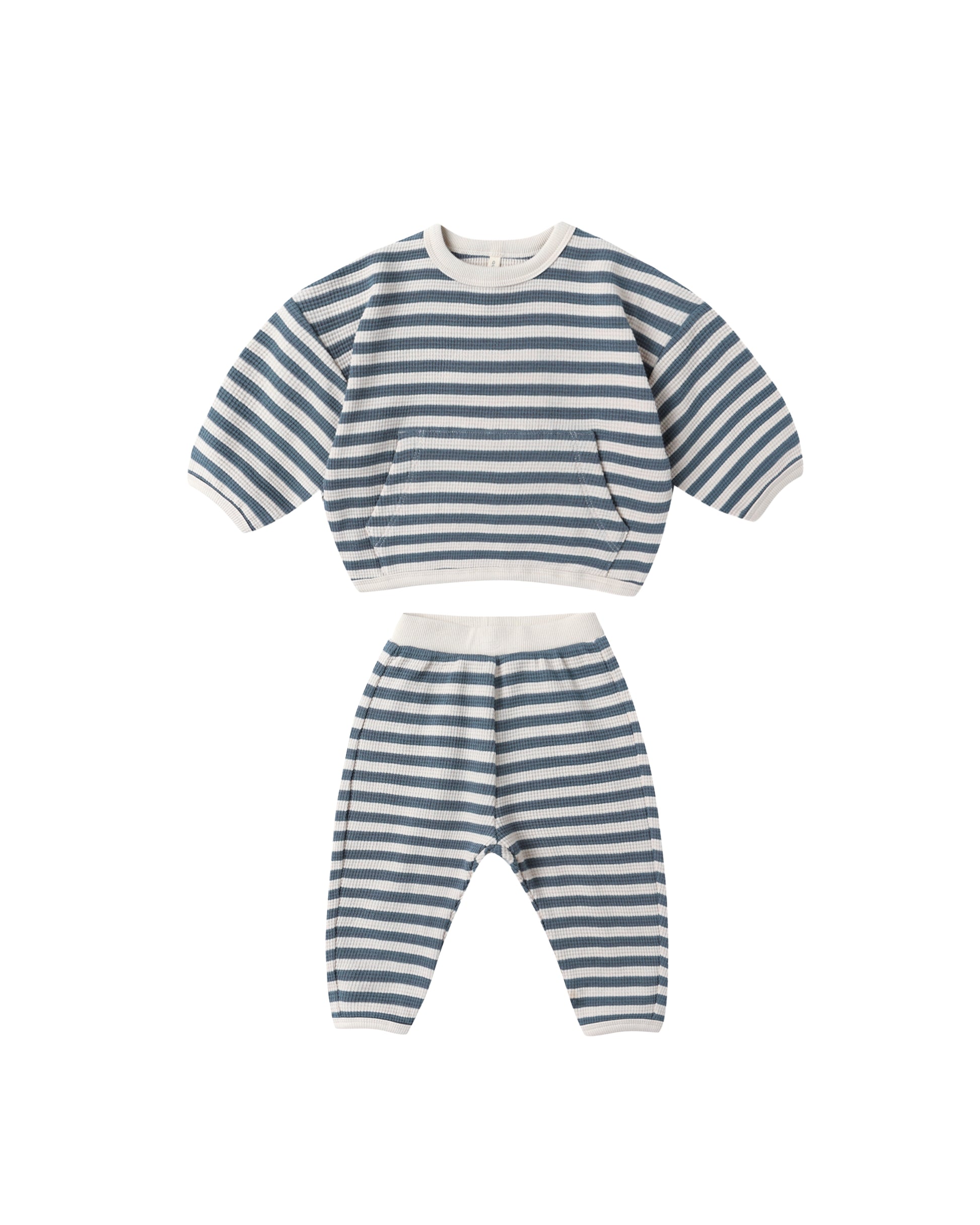 Our Waffle Slouch Set includes a long sleeve top with a large front pocket and matching pants—perfect for lounging and play.